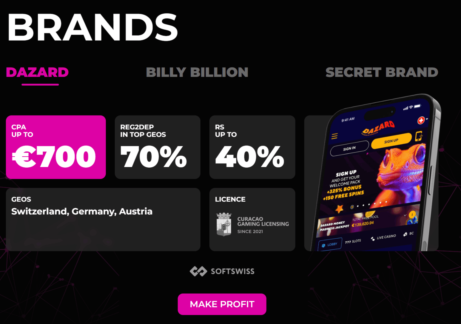 Dazard Casino – игровая платформа, действующая на основе лицензии Кюрасао. Онв пользуется популярностью среди игроков из локали Tier-1. Казино Billy Billion работает на базе мальтийского лицензирования, востребовано в странах Европы, особенно в Германии. Популярность игровых платформ в гео Tier-1 и Tier-2, высокий показатели конверсии обеспечивают высокий доход для вебмастеров. На выбор представлено несколько вариантов монетизации: CPA со ставкой до 700 евро, RevShare по системе reg2dep с комиссией до 70% в оффере казино booi. Нужно полить трафик и проверить выхлоп.