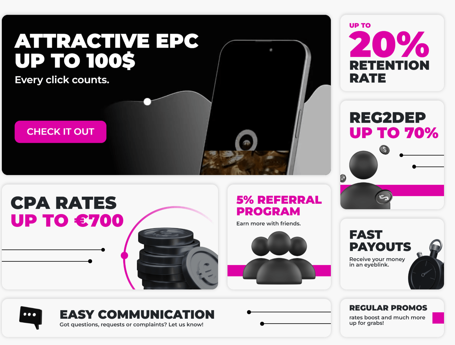 Партнерка работает с собственными лицензированными брендами с высокими значениями конверсии;