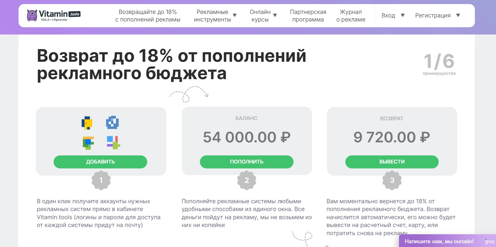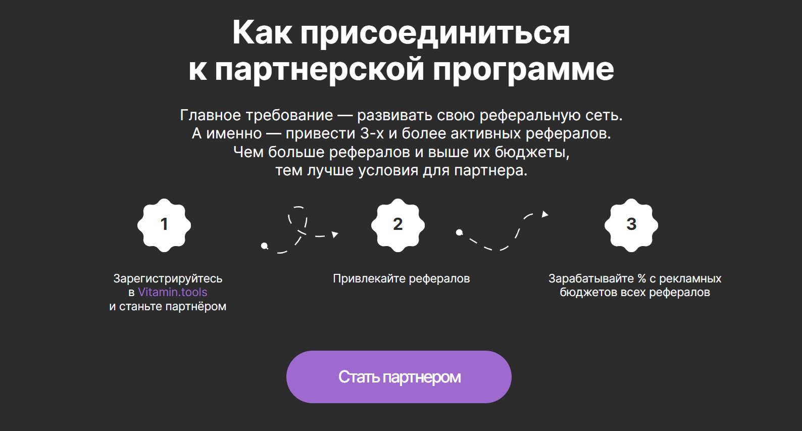 Vitamin.tools – российская рекламная экосистема. Платформа предназначена для бизнеса, рекламных агентств и фрилансеров. Первым сервис предлагает большую экономию бюджета за счет увеличения отдачи от рекламы, а вторым – высокие проценты возврата от суммы пополнения рекламных кабинетов. Функционал платформы включает инструменты для гиперсегментации, А/В тестирования, маркировки рекламы и полной финансовой отчетности, а также рекомендатор, биддер, генератор меток, конструктор приложений и посадочных страниц? мониторинг офферов казино джозз, нормализатор ключей. Есть многоуровневая партнерская программа для пассивного дохода